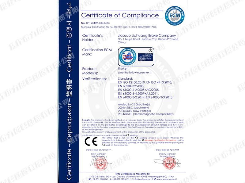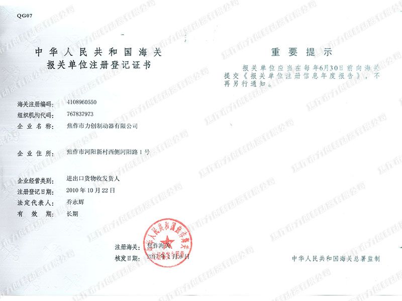 公司于2005年通過ISO9001質量管理體系認證,2011年通過了安標國家礦用產品認證審核,并取得防爆合格證與煤安證,先后被焦作市評定為高新技術企業、中小科技型企業、焦作市風電制動器工程技術,公司于2008年取得了風電高速軸制動器與偏航制動器兩項專利,2011年獲得風電高速軸制動器與SBD系列制動器兩項河南省科技進步二等獎,2013年獲得二項實用新型專利。